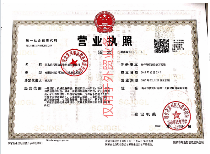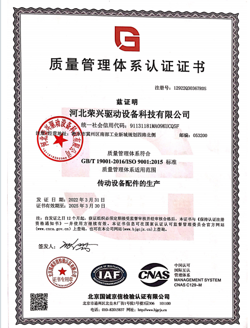 Hebei Rongxing Driving Equipment Technology Co., Ltd.  is a professional R&D and manufacturer of couplings, cardan shafts and gearboxes with a registered capital of 36.88 million. The company covers an area of 55 acres, with a production workshop of 12,000 square meters and 108 production equipment. With strong strength, advanced technological process and more than 20 years of manufacturing experience, the company has passed ISO9001 quality management system certification. It was recognized as a high-tech enterprise by Hebei Province Industry and Information Technology. It is a member unit of transmission connecting parts of China Machinery General Parts Industry Association, and has eight utility model patent certificates.